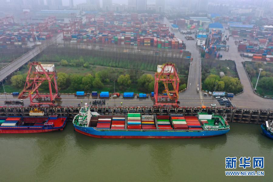 2月28日,停靠在碼頭的“漢海5號”準備首航駛往上海洋山港(無人機照片)。新華社發(趙軍 攝)