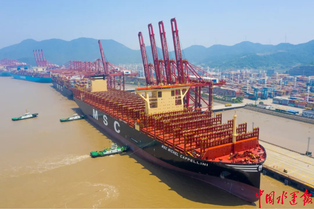 我國自主研制的超大型集裝箱船“地中海米歇爾卡佩里尼”輪首航首站靠泊寧波舟山港穿山港區集裝箱碼頭4號泊位
