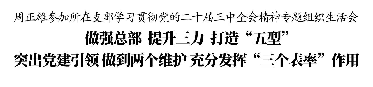 8月14日,集團(tuán)機(jī)關(guān)第一黨支部召開學(xué)習(xí)貫徹黨的二十屆三中全會精神專題組織生活會,集中學(xué)習(xí)習(xí)近平總書記關(guān)于推動機(jī)關(guān)黨建高質(zhì)量發(fā)展作出的重要指示精神。集團(tuán)黨委書記、董事長周正雄以普通黨員身份參加會議。