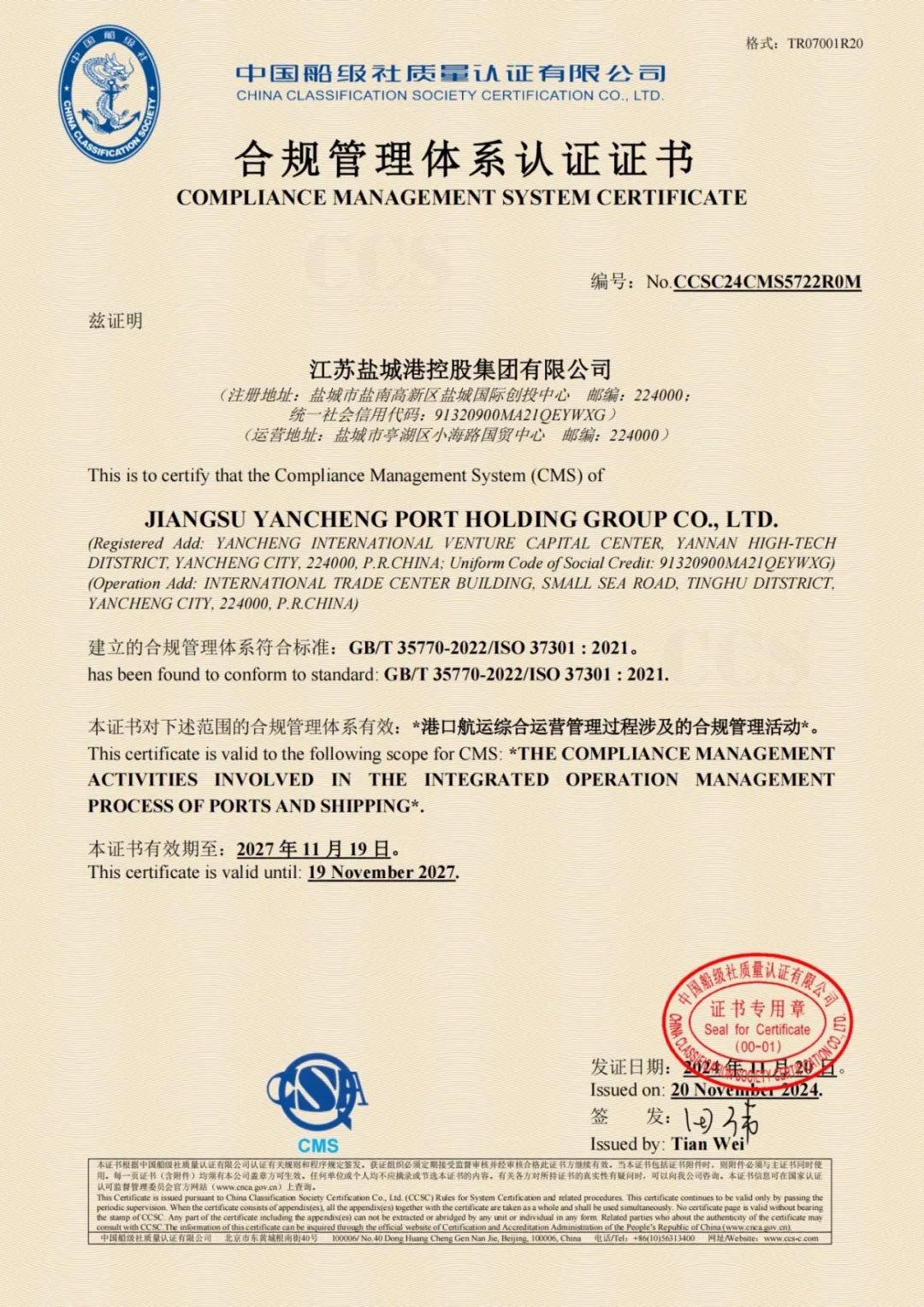 11月22日,鹽城港集團順利通過中國船級社質量認證有限公司(CCSC)的合規(guī)管理體系審核認證,獲得合規(guī)管理體系認證證書,成為江蘇省首家獲得合規(guī)管理體系證書的港航企業(yè)。