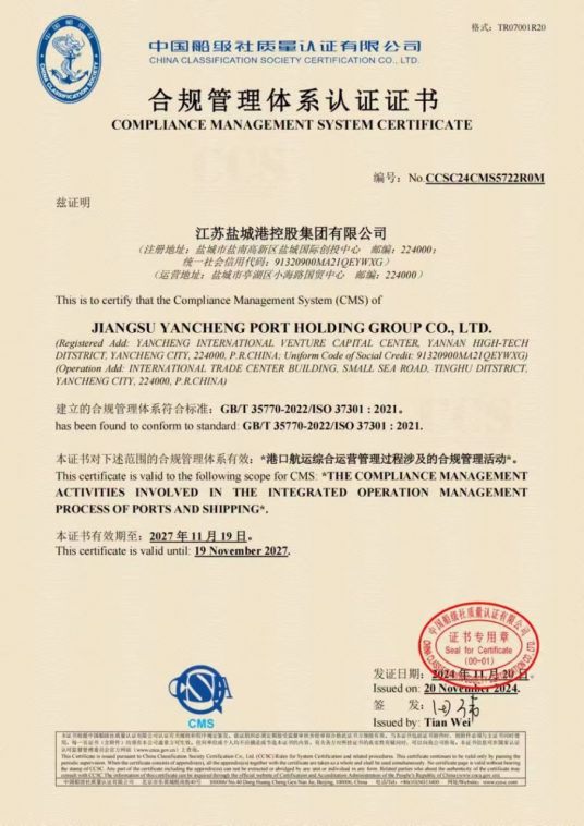 11月22日,鹽城港集團順利通過中國船級社質量認證有限公司(CCSC)的合規管理體系審核認證,獲得合規管理體系認證證書,成為江蘇省首家獲得合規管理體系證書的港航企業。
