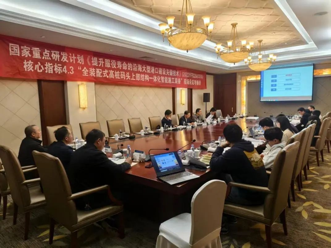 本工程位處大豐港區(qū)開敞海域,常年風(fēng)浪大,最大潮差達(dá)到6米,漲落潮流急,傳統(tǒng)浮式起重船無法完成上部結(jié)構(gòu)施工。為解決惡劣海況下碼頭上部結(jié)構(gòu)快速安裝問題,為項目量身打造的智能筑港機(jī),該設(shè)備配備了數(shù)字監(jiān)控平臺,在安裝下放過程中,系統(tǒng)自動識別梁板安裝目標(biāo)位置圖像后,將構(gòu)件快速、平穩(wěn)、精準(zhǔn)落入,實現(xiàn)全過程智能安裝。全裝配式高樁碼頭上部結(jié)構(gòu)一體化智能施工裝備是國家重點研發(fā)計劃項目的核心指標(biāo),趁此階段項目組組織召開了現(xiàn)場見證考核會,邀請來自鹽城市交通運(yùn)輸局、鹽城市港航事業(yè)發(fā)展中心、鹽城市交通規(guī)劃設(shè)計院等單位的專家到現(xiàn)場進(jìn)行見證考核,經(jīng)過現(xiàn)場考察、會議審查及資料查閱,一致認(rèn)為達(dá)到了考核指標(biāo)要求,至此該裝備研發(fā)在此項目上的科技創(chuàng)新示范應(yīng)用得到了有力的成功驗證。