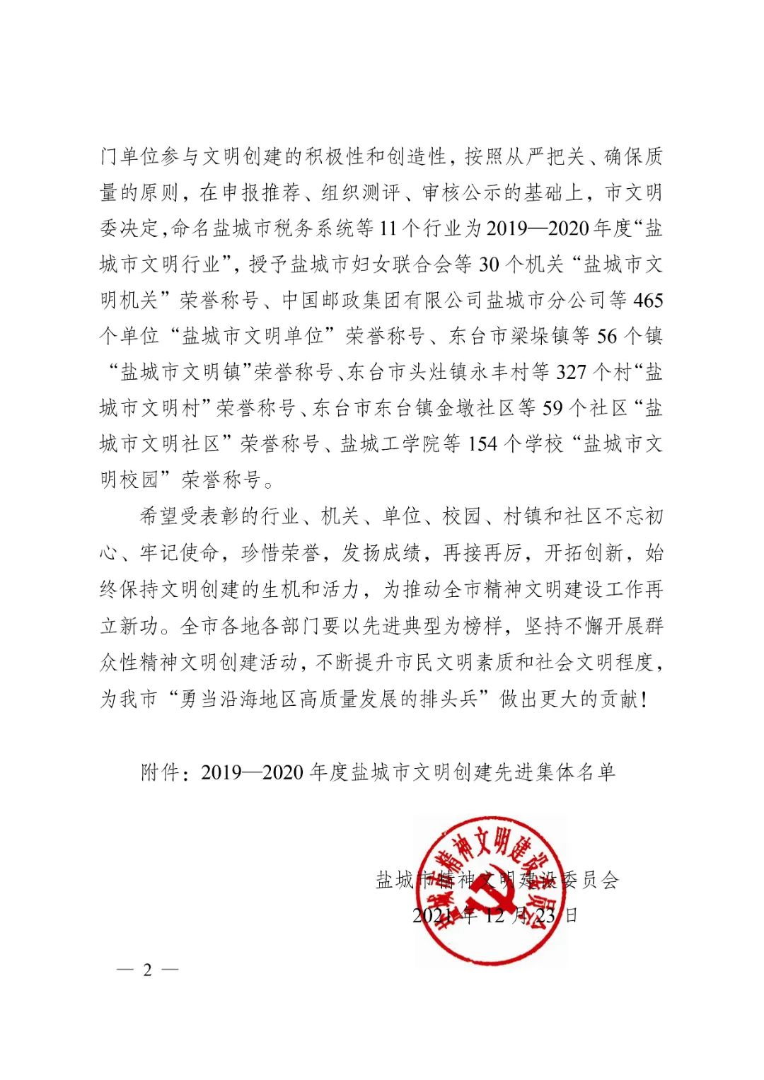 12月23日,鹽城市精神文明建設委員會發布《關于命名表彰2019-2020年度鹽城市文明創建先進集體的決定》,集團榮獲2019-2020年度“鹽城市文明單位”榮譽稱號。