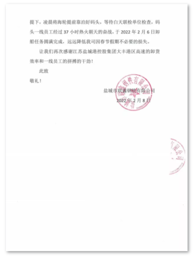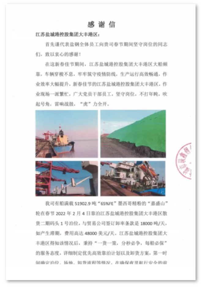 鹽城港大豐港區港口公司┃新年禮物——來自客戶的一封感謝信