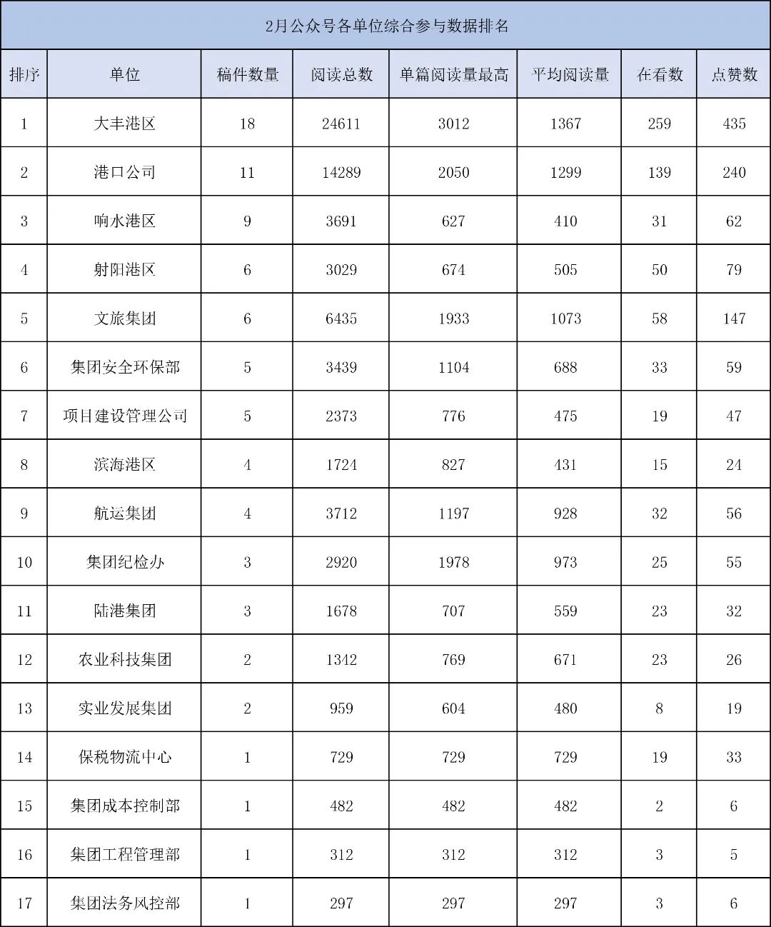 “首季開門紅”向來是新聞報道的高產期,特別是一線生產單位亮點頻出。從二月份稿件數據統計來看,大豐港區依然蟬聯第一“寶座”,發稿18篇;港口公司繼續發力,成稿11篇,位列第二;響水港區緊隨其后,發稿9篇。其他單位齊齊發力,紛紛積極供稿!