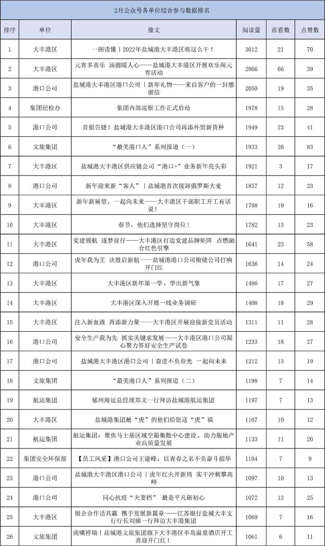 2月榜單,鹽城港集團公眾號“前浪”表現可圈可點,“后浪”蓄勢待發。這個2月,是誰遙遙領先?誰又在奮起直追?請看2月榜單!