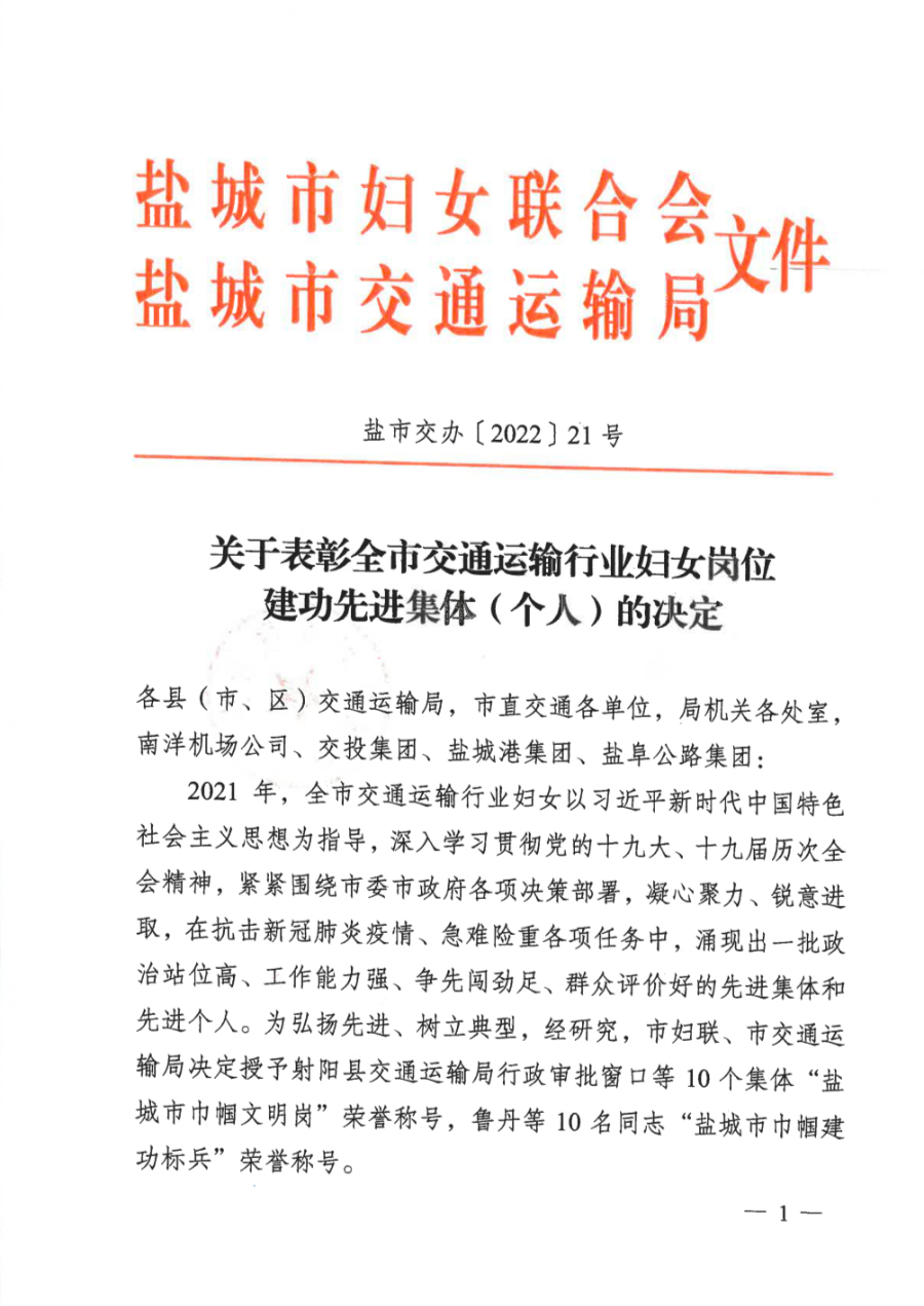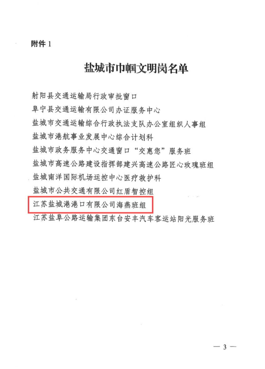 近日,市婦聯(lián)、市交通運輸局聯(lián)合發(fā)布《關(guān)于表彰全市交通運輸行業(yè)婦女崗位建功先進集體(個人)的決定》,鹽城港港口公司“海燕”班組榮獲“鹽城市巾幗文明崗”榮譽稱號。
