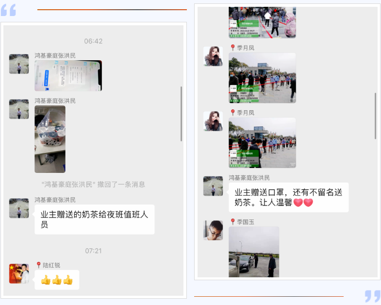 鹽城港物業人對防疫工作的責任與擔當,業主們看在眼里,暖在心里。有的自發捐助口罩、食品、暖寶寶,甚至牛奶、水果給值班“戰士”,讓戰斗在一線的物業人感到溫暖,聲聲感謝,是肯定,更是責任。他們時刻要面對疫情,在逆行中研究措施,在奔跑中調整姿勢。眾志成城、攻堅克難,防控疫情不松懈,這是一份植根鹽城港物業人內心的宣言??挂咔?、守平安,鹽城港物業人用實際行動共同守護著我們美麗的家園。