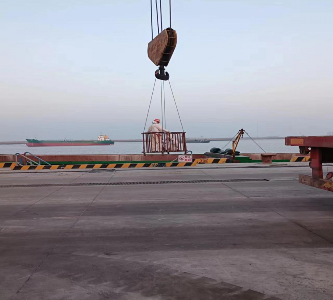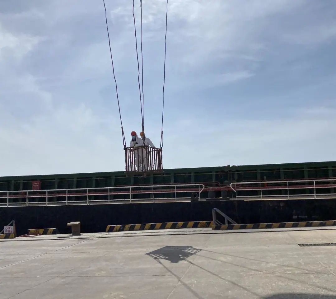 △清艙人員乘坐特殊“交通工具”下艙進行清理工作