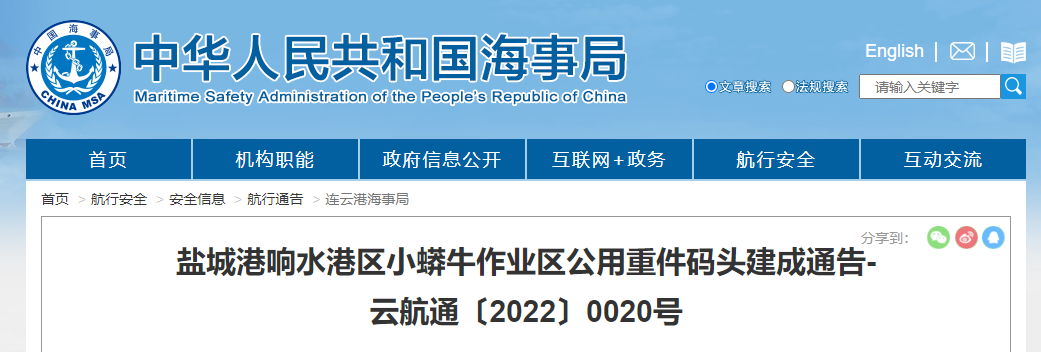 近日,連云港海事局在官網發布鹽城港響水港區小蟒牛作業區公用重件碼頭建成公告(通航公告)。該碼頭通航運營后將打開海河聯運出海通道,有效激活港口樞紐功能,更好統籌協調地方發展。