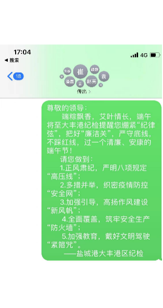 “繃緊‘紀律弦’,把好‘廉潔關’,嚴守底線,不踩紅線,過一個清廉安康的端午節!”為進一步增強全體干部職工廉潔自律意識,鹽城港大豐港區紀檢常態化開展警示教育活動,以發送廉政短信、發放廉潔提醒等形式將廉政教育抓好抓實。