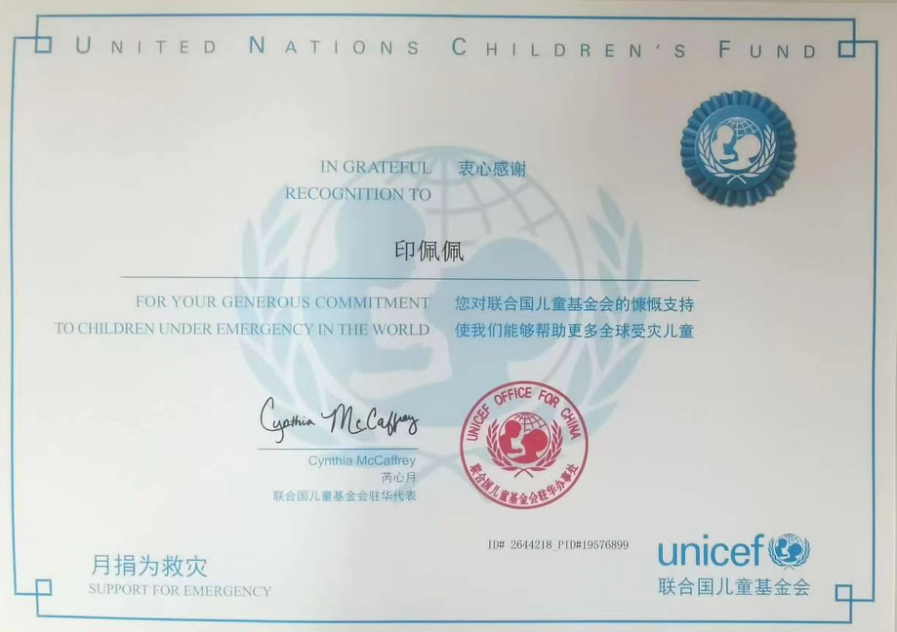 近年來(lái),有越來(lái)越多的愛(ài)心單位、社會(huì)組織和義工、志愿者不斷參與關(guān)愛(ài)兒童行動(dòng),讓孩子可以在愛(ài)的陽(yáng)光下健康快樂(lè)成長(zhǎng)。今天,鹽城港港口公司“海燕”班組成員印佩佩同志收到了來(lái)自聯(lián)合國(guó)兒童基金會(huì)的捐獻(xiàn)證書。自去年加入“海燕”班組以來(lái),印佩佩堅(jiān)持每月向聯(lián)合國(guó)兒童基金會(huì)捐款,用最簡(jiǎn)單、最直接的方式關(guān)注兒童、支持兒童、幫助兒童,為祖國(guó)花朵捐出一份愛(ài)心、奉獻(xiàn)一片真情。