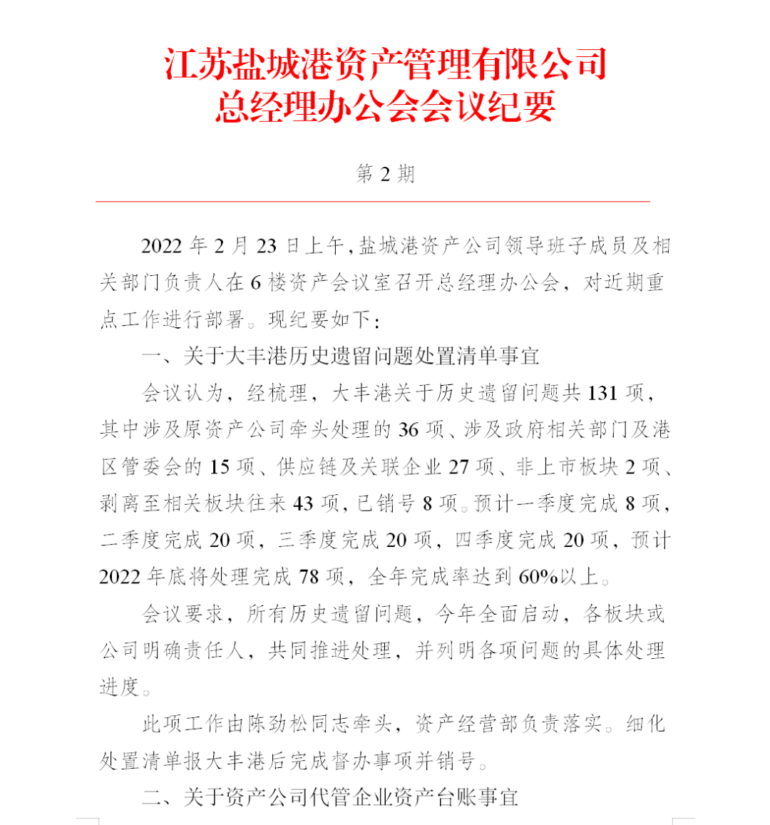 處理處置完成大豐港區閑置、低效資產2.58億元,其中:有問題在建工程0.49億元,有問題待攤費用0.54億元。目前正在加快推進奧特萊斯、和順環保科技、港鑫銅業、市民卡、水務公司、蘇港包裝等企業的資產處置工作。