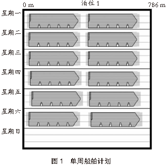 2.3 船舶泊位參數(shù)根據(jù)港口提供的實際船舶和泊位規(guī)格參數(shù),建立船舶精確模型和簡化模型,具體模型按照現(xiàn)場作業(yè)需求和仿真系統(tǒng)實際運行情況進(jìn)行選擇。為了對港口堆場作業(yè)進(jìn)行有效的仿真分析,在設(shè)置泊位參數(shù)時,優(yōu)先考慮實際作業(yè)過程中最大泊位通過能力。按照單周作業(yè)計劃進(jìn)行工況設(shè)定,單周計劃作業(yè)船舶12艘,單艘船舶裝箱量為420~ 530 TEU,卸箱量為420~530 TEU。單周船舶計劃見圖1。