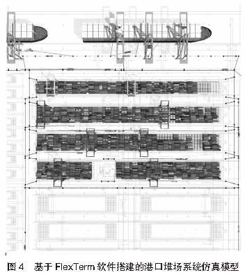 3.2 堆場仿真系統(tǒng)模型根據(jù)堆場仿真系統(tǒng)架構(gòu),以某港口自動化堆場作業(yè)的實際運行環(huán)境為基礎(chǔ),分別搭建基于AnyLogic軟件和FlexTerm軟件的港口自動化堆場系統(tǒng)仿真模型。基于AnyLogic軟件搭建的港口堆場系統(tǒng)仿真模型見圖3,基于FlexTerm軟件搭建的港口堆場系統(tǒng)仿真模型見圖4。