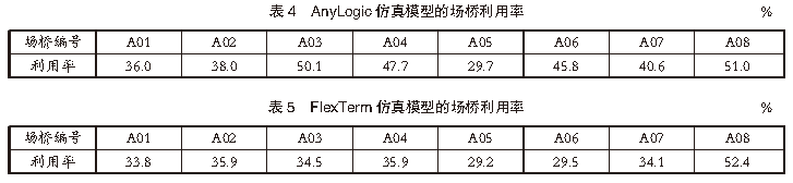 4仿真結(jié)果分析利用港口自動化堆場相關(guān)數(shù)據(jù),分別對基于AnyLogic軟件和FlexTerm軟件的堆場系統(tǒng)仿真模型的仿真結(jié)果進(jìn)行對比分析。4.1 場橋利用率對比在集裝箱堆場作業(yè)中,場橋是提高堆場作業(yè)效率的關(guān)鍵因素。合理分析場橋利用率對提高堆場作業(yè)效率、減少船舶在港停泊時間尤為重要。根據(jù)港口提供的堆場作業(yè)參數(shù)和實際堆場作業(yè)的場橋利用情況,對堆場內(nèi)場橋使用情況進(jìn)行仿真對比分析。AnyLogic仿真模型的場橋利用率見表4,F(xiàn)lexTerm仿真模型的場橋利用率見表5,2種仿真模型的場橋利用率對比見表6。