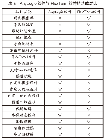 在港口自動化堆場仿真領(lǐng)域,F(xiàn)lexTerm軟件的專業(yè)性更強(qiáng)。FlexTerm軟件作為港口碼頭仿真專用軟件,具備完整的港口碼頭仿真模型庫;AnyLogic軟件作為通用型仿真軟件,具備涵蓋多個應(yīng)用領(lǐng)域的模型庫,但涉及港口碼頭的模型庫較為簡陋。FlexTerm軟件具備完善的集裝箱裝卸策略和港口碼頭專業(yè)數(shù)據(jù)統(tǒng)計分析功能;AnyLogic軟件只具備通用的數(shù)據(jù)統(tǒng)計分析功能,專業(yè)性相對較差。在港口自動化堆場仿真領(lǐng)域,AnyLogic軟件的可操作性更好。首先,AnyLogic軟件支持多方法建模,而FlexTerm軟件目前僅支持離散建模方法。其次,AnyLogic軟件支持多種數(shù)據(jù)驅(qū)動方式,且能與外部系統(tǒng)軟件進(jìn)行交互,而FlexTerm軟件僅支持?jǐn)?shù)據(jù)以Excel表格的形式導(dǎo)入,且無法對接外部軟件系統(tǒng)。最后,AnyLogic軟件的可開發(fā)性強(qiáng),借助Java模塊可以設(shè)計開發(fā)特殊模型或編輯自定義模型庫文件,而FlexTerm軟件僅支持?jǐn)U展開發(fā)港口裝卸和調(diào)度運輸?shù)确抡婺K,無法進(jìn)行模型開發(fā)設(shè)計,可操作性相對較差。