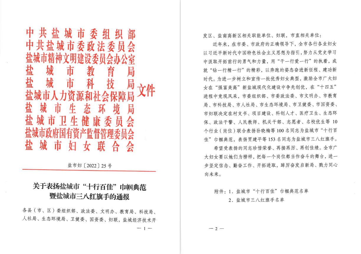 近日,鹽城市婦女聯合會發布《關于表揚鹽城“十行百佳”巾幗典范暨鹽城市三八紅旗手的通報》,袁欣同志榮獲“鹽城市十佳巾幗項目功臣”“鹽城市三八紅旗手”榮譽稱號。