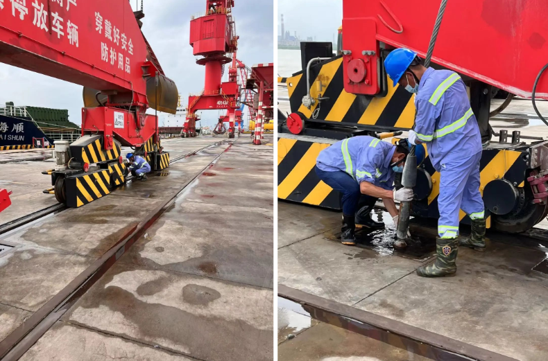 演練模擬安全環保部人員接到上級氣象災害預警通知,我區域將出現強降水、8級以上雷暴大風極端天氣。接到通知后,相關部門立即停止室外作業,緊急啟動《防臺防汛應急預案》。門機防風演練現場,應急演練人員打開隱藏式坑位蓋板,門機移機定位、下錨定插板、加固防風拉索,快速完成單臺門機防風加固任務。物流園防汛演練現場,搶險人員對室外堆場進行針對性排水,并用沙袋將倉庫、配電房等重點部位進行封堵,迅速完成防洪墻堆建。