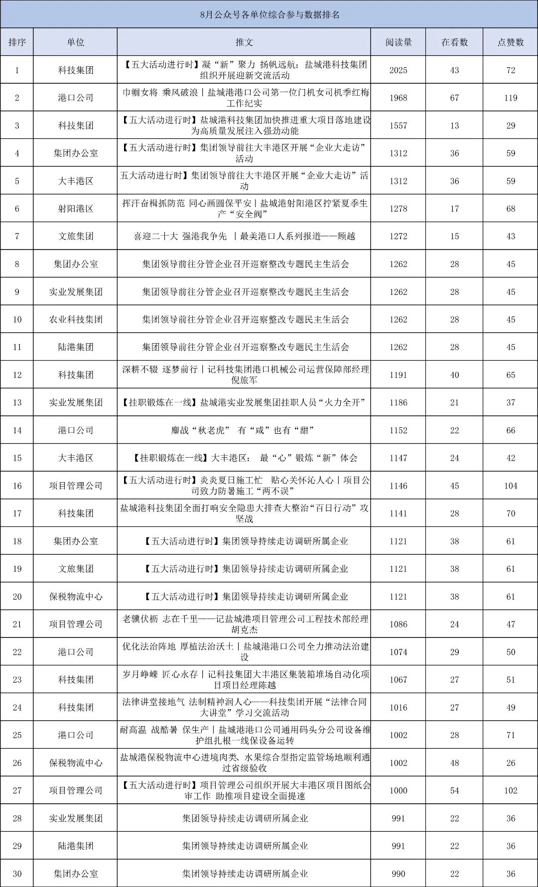 告別熱情似火的8月,迎來天高云淡的9月,鹽城港微信公眾號(hào)8月份排行榜又如期而至,與大家見面了。與7月份榜單相比,8月份榜單有哪些變化呢?我們一起來看看。