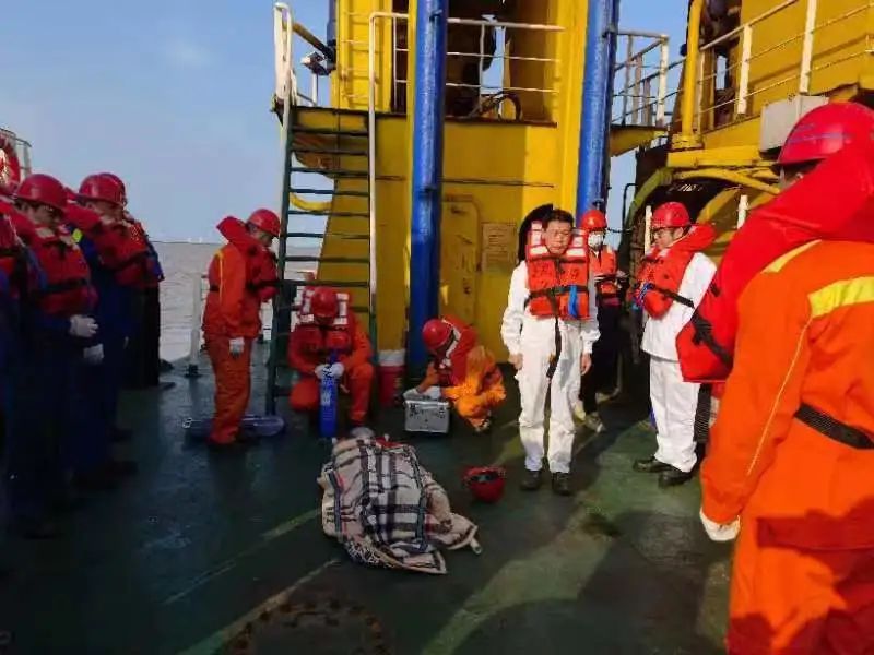 隨后進(jìn)行的是人員落水演習(xí)。“報(bào)告,皮龍隊(duì)一人整理皮龍帶時(shí)不慎落水。”“天虎號(hào)”船長(zhǎng)接報(bào)后立刻指令駕駛員發(fā)出有人落水警報(bào),并通知交通船協(xié)助救援,同時(shí)向項(xiàng)目部、公司調(diào)度室報(bào)告人員落水情況;打撈隊(duì)將落水人員救撈上來(lái)后,救護(hù)隊(duì)采用控水、心肺復(fù)蘇等急救措施對(duì)落水人員進(jìn)行模擬救助,經(jīng)搶救后落水者蘇醒,船長(zhǎng)安排相關(guān)人員將落水者送往醫(yī)院接受進(jìn)一步檢查。