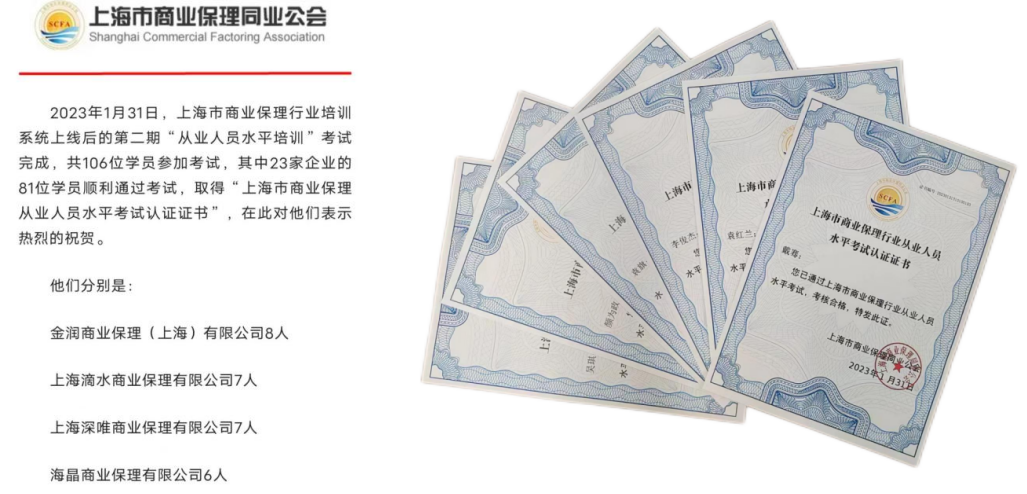 近日,海晶商業(yè)保理有限公司6名員工參加上海市商業(yè)保理水平培訓(xùn),順利通過考試并取得認(rèn)證證書。考試通過人次在上海市商業(yè)保理行業(yè)名列前茅,充分展示了出色的專業(yè)水準(zhǔn)。