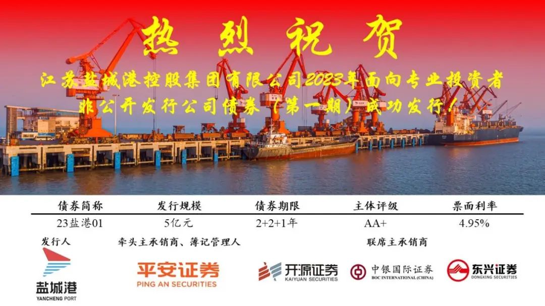 2月23日,鹽城港集團2023年度第一期私募公司債成功發行,金額5億元,發行利率4.95%。本期私募公司債為集團本部私募產品首次公開市場亮相,進一步提振了金融機構對鹽城港集團發展的信心,鞏固了集團在資本市場的口碑與信譽。