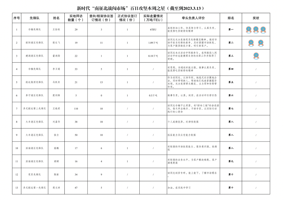 第一名:巾幗先鋒隊(duì) 王怡秋(拜訪客戶29家、簽訂意向協(xié)議3份,簽訂正式協(xié)議1份,實(shí)際走量6TEU)
