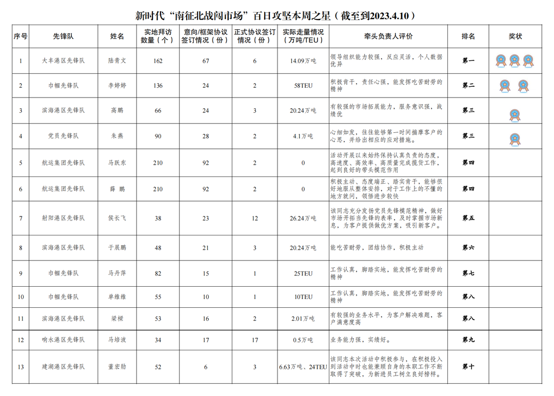 第三名:濱海港區(qū)先鋒隊 高鵬(拜訪客戶66家,簽訂意向協議24份,簽訂正式協議3份,實際走量20.24萬噸),黨員先鋒隊 朱燕(拜訪客戶90家,簽訂意向協議28份,簽訂正式協議2份,實際走量4.1萬噸)