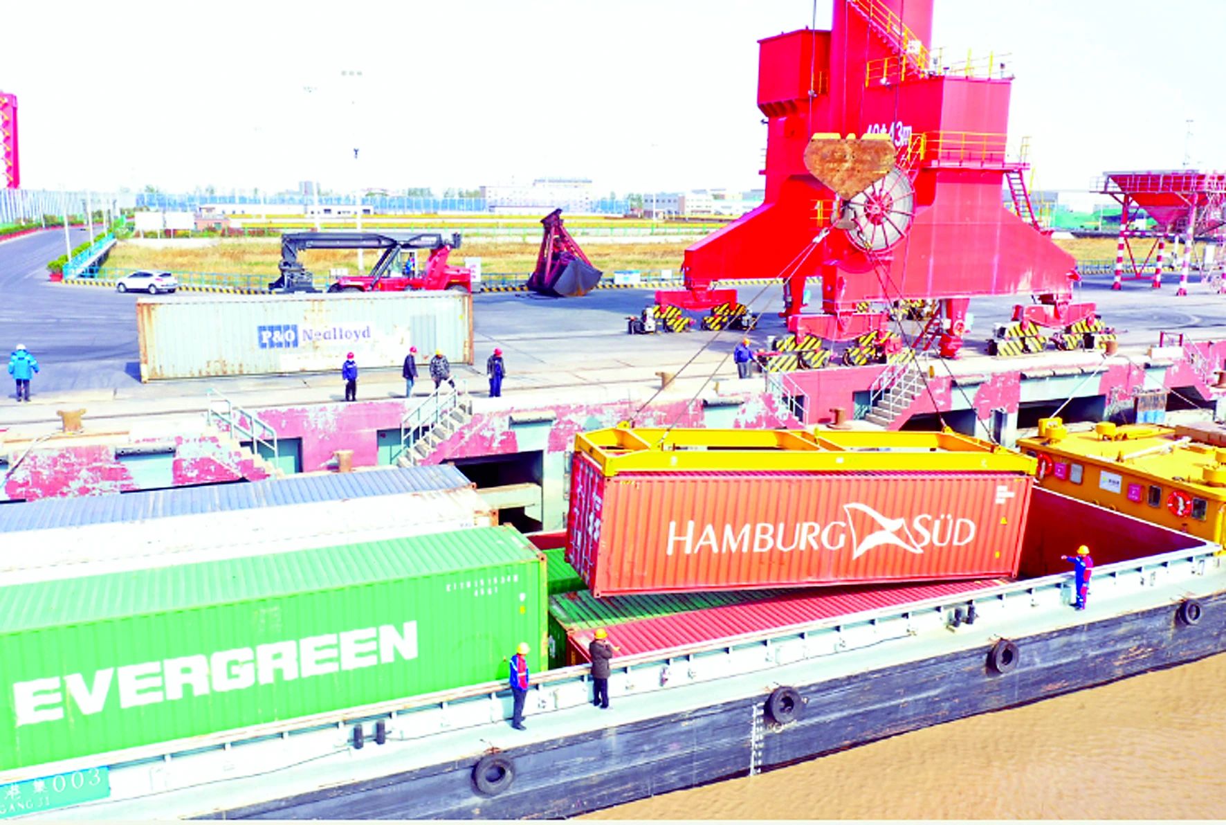 “嗚……”4月21日下午,隨著汽笛長鳴,滿載集裝箱的“大港集003”號貨輪緩緩駛?cè)臌}城港響水港區(qū)5#泊位碼頭,貨船上的工作人員向岸邊拋出系泊纜繩固定貨船,碼頭上的吊機開始作業(yè),有條不紊地將集裝箱裝卸到拖車上。這是響水港區(qū)首次迎來集裝箱貨輪,標(biāo)志著鹽城港響水港區(qū)至重慶果園港內(nèi)河集裝箱班輪航線試運營成功。
