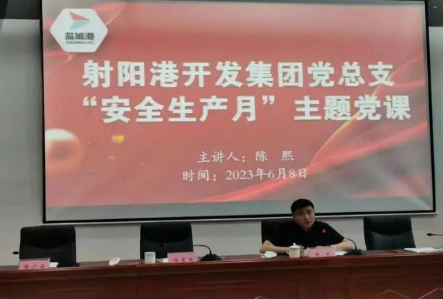 為切實發揮各級黨組織和廣大黨員在安全生產中的戰斗堡壘作用和先鋒模范作用,近日,射陽港區黨總支根據近年來習近平總書記關于安全生產的重要論述,結合港區安全風險點,為全體員工和駐港單位上了一堂安全生產主題黨課,要求與會人員強化防范措施,在狠抓工作落實的同時,嚴格統籌發展和安全。