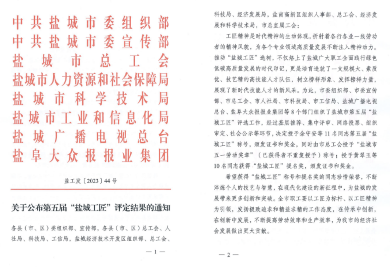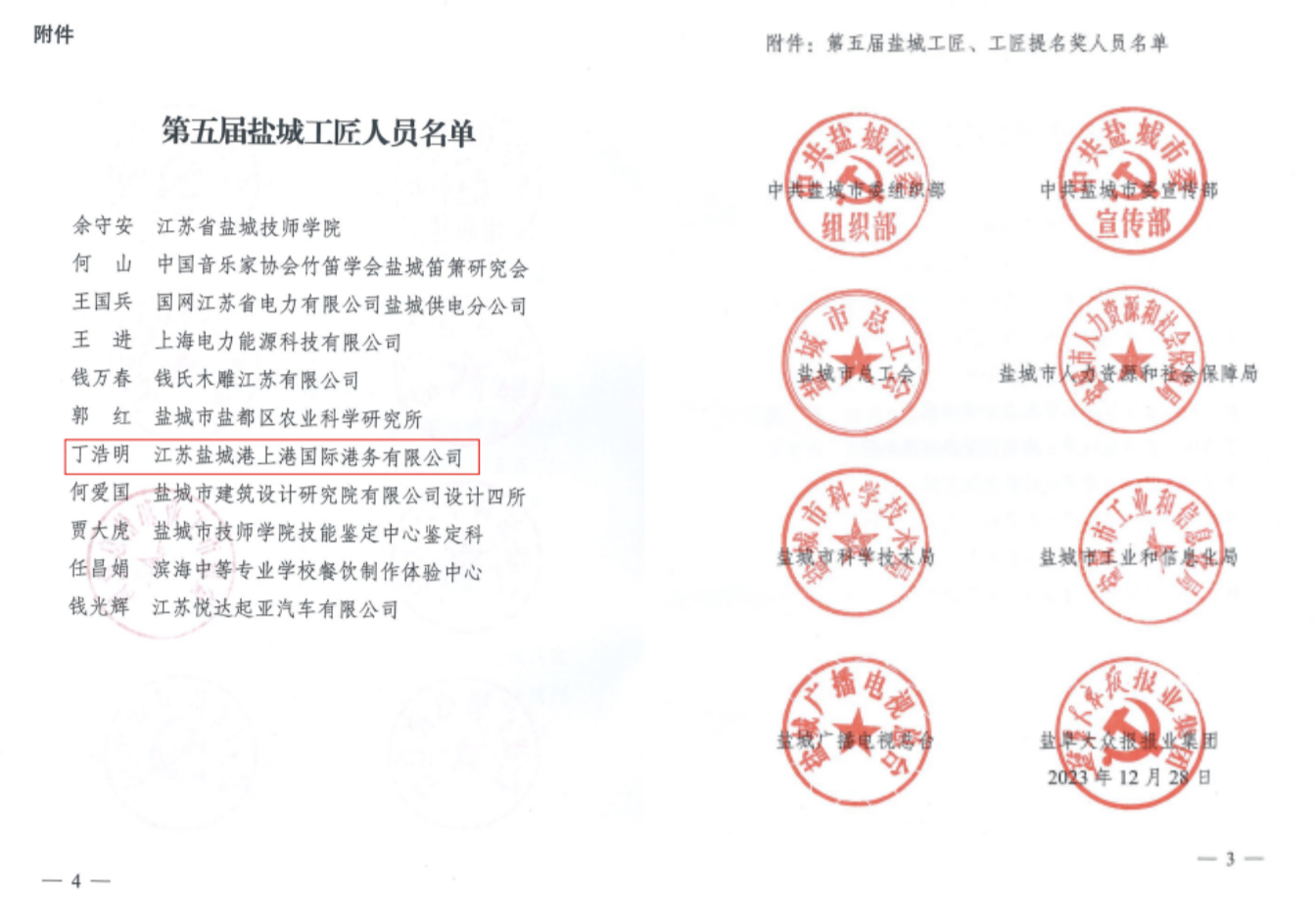 近日,由市委組織部、市委宣傳部、市總工會、市人力資源和社會保障局等8個部門組織了鹽城市第五屆“鹽城工匠”評選工作,決定授予江蘇鹽城港上港國際港務有限公司丁浩明同志“鹽城工匠”稱號。