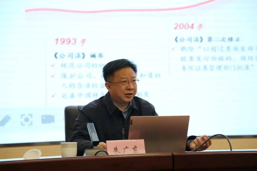 會上,朱廣東教授圍繞新《公司法》的修訂背景,對《公司法》修訂要點進行了全面、細致、生動地解讀,為公司管理人員正確理解、運用新《公司法》提供了專業指導。大豐港開發集團、射陽港開發集團、智慧港口公司三家單位負責同志圍繞學習內容并結合工作崗位實際作交流發言。