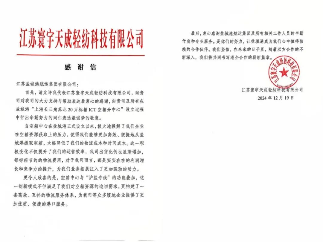 近日,鹽城港航運集團收到江蘇寰宇天成輕紡科技有限公司一封飽含濃濃謝意的信箋,信中字字深情,句句滾燙,高度贊揚了鹽城港為“上港長三角蘇北20萬標箱ICT空箱分中心”的設立啟用所付出的努力,并對鹽城港航運集團主動作為、精誠服務、共贏發展的合作精神表示衷心感謝。