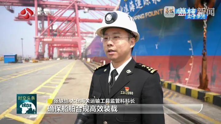 太倉海關運輸工具監管科科長張軼愷說:“實地開展貨物監裝,確保船舶合規高效裝載;同時開設服務專窗,為企業提供預約通關服務。”