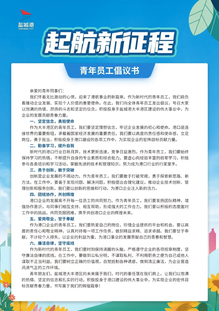 深入機(jī)關(guān)、碼頭一線、項(xiàng)目建設(shè)現(xiàn)場(chǎng),發(fā)放《起航新征程——青年員工倡議書(shū)》200余份,號(hào)召?gòu)V大青年,以飽滿的熱情、昂揚(yáng)的斗志和堅(jiān)定的信念,積極投身于鹽城港大豐港區(qū)建設(shè)的偉大事業(yè)中,為億噸大港建設(shè)貢獻(xiàn)青春力量。