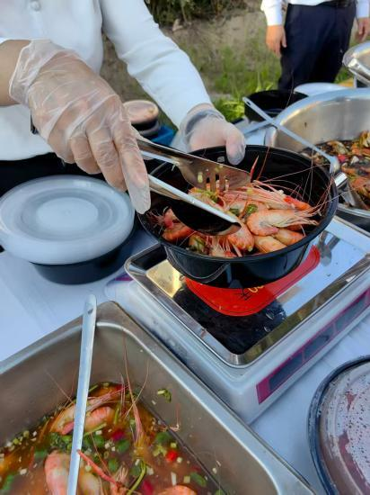“星廚外擺”的活動好評不斷,市民排隊選購的場景成為社區一景。針對近期持續高溫天氣,酒店高度重視食品安全與品質保障,一是全程恒溫保障:確保熱食恒溫、冷食冷藏(0-4℃),有效抑制細菌滋生。二是嚴控出品時效:嚴格執行“即制即送、限時銷售”原則,所有菜品從制作完成到送達銷售點不超過60分鐘,在攤位展示銷售時間嚴格控制在90分鐘以內,超時未售出即刻下架回收,杜絕食品安全隱患。三是強化人員防護:所有外擺服務人員均佩戴口罩、一次性手套,嚴格執行崗前健康檢查和手部消毒流程。四是動態質量監控:現場管理人員進行高頻次巡檢,確保食品色澤、氣味、狀態始終符合五星級出品標準。