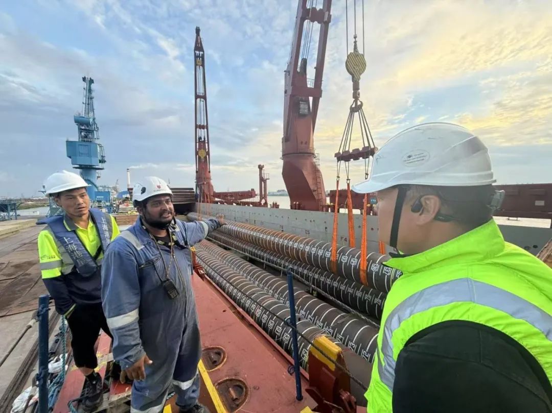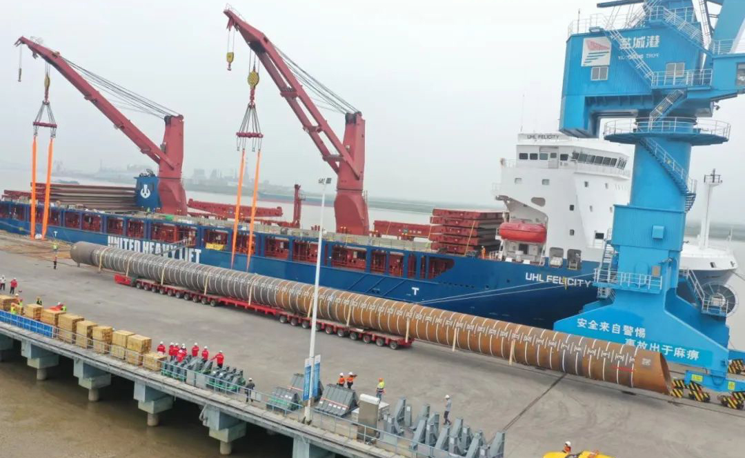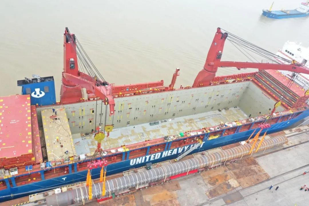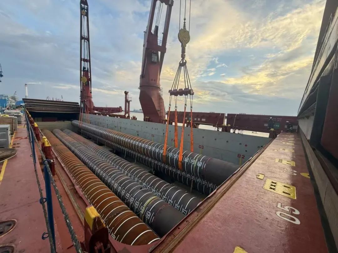 “幸福號”貨輪承載著江蘇天能海洋重工有限公司精心制造的尖端管樁裝備,這些“大國重器”將遠赴中東,為當?shù)赜蜌赓Y源開發(fā)提供關鍵基礎設施支持。全船共裝載45件管樁及配套鋼結(jié)構(gòu),其中管樁長度普遍超過40米,最長達76.8米,單件最大重量突破377噸,堪稱“海上鋼鐵巨龍”。