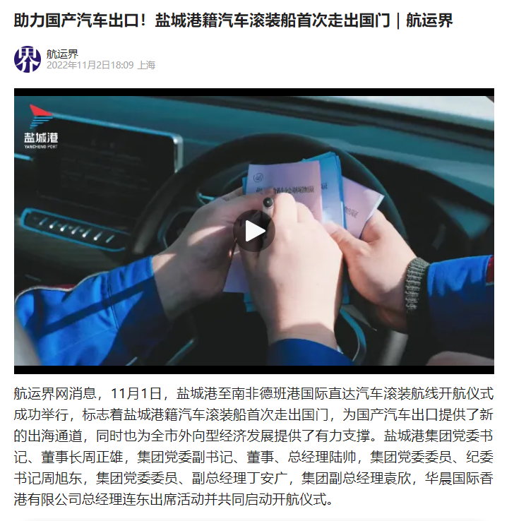 鹽城港至南非德班港國際直達汽車滾裝航線開航引發媒體廣泛關注