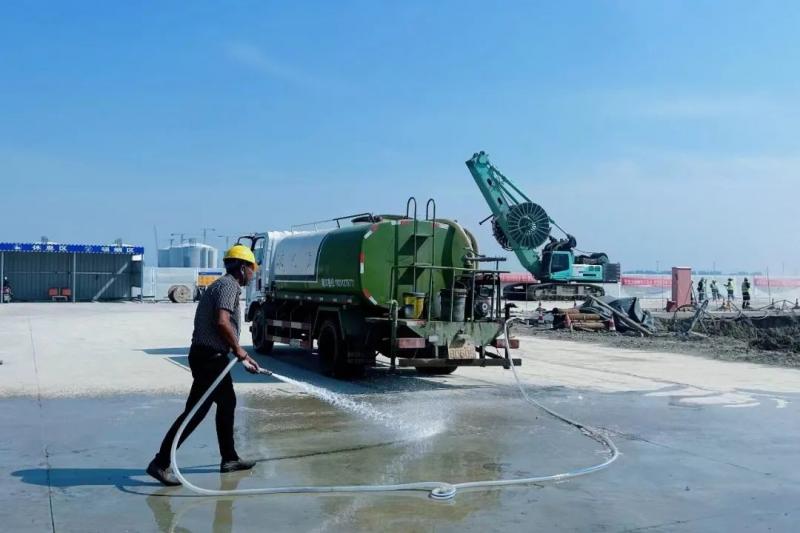 一是提高環(huán)境整潔度。在施工期間,對(duì)施工現(xiàn)場(chǎng)主要通道、道路進(jìn)出口、材料加工區(qū)、生活辦公區(qū)進(jìn)行硬化處理。安排灑水車輛定時(shí)傾灑施工便道,確保道路干凈無淤泥、無浮土、無積水。做好圍擋全封閉、土方挖運(yùn)作業(yè)降塵、渣土車輛密閉運(yùn)輸、裸露地面全覆蓋等工作,將揚(yáng)塵管控作為日常工作常抓不懈。