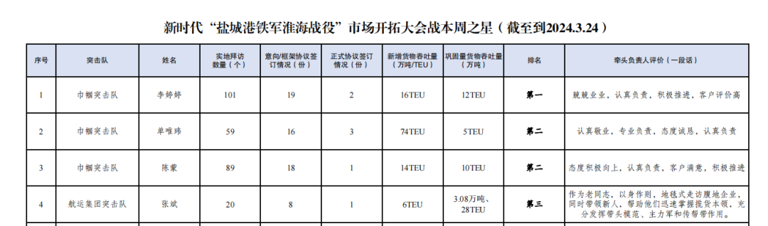 為確保新時(shí)代“鹽城港鐵軍淮海戰(zhàn)役”市場(chǎng)開拓大會(huì)戰(zhàn)取得實(shí)效,航運(yùn)集團(tuán)突擊隊(duì)和巾幗突擊隊(duì)堅(jiān)持“早晨會(huì)、晚匯報(bào)”工作機(jī)制,全面梳理腹地市場(chǎng),明確目標(biāo)客戶群體,制定詳細(xì)的市場(chǎng)開拓計(jì)劃。同時(shí),強(qiáng)化攬貨人員培訓(xùn),以“戰(zhàn)功第一、全力以赴,令行禁止、使命必達(dá)”的要求,按照“我說你聽、你說我聽,我做你看、你做我看”老帶新模式,通過發(fā)放“流動(dòng)紅旗”并將“奔牛”“蝸牛”在當(dāng)月績效中予以體現(xiàn)的方式,“比學(xué)趕超,樹立典型”,進(jìn)一步發(fā)揮榜樣力量,不斷提升服務(wù)水平,以“軟實(shí)力”助推“硬發(fā)展”。