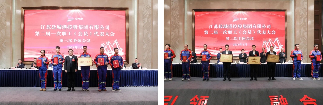 會議現(xiàn)場為榮獲2023年市技能競賽先進集體、“鹽城市五一創(chuàng)新能手”先進個人、首屆長江港口門式起重機集裝箱岸邊吊操作工職業(yè)技能競賽團體一等獎、中華全國總工會“云宣講”達人的單位及個人頒獎。