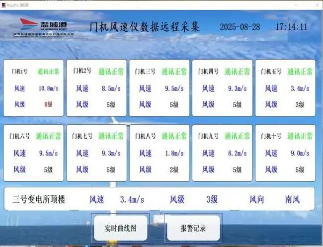 以往,門機實時風速數(shù)據僅能在司機室查看,值班室調度人員、現(xiàn)場管理人員無法同步獲取,存在信息滯后導致的安全風險。通過加裝高精度風速傳感器,搭配低延遲無線傳輸模塊,將風速數(shù)據實時推送至值班室監(jiān)控大屏與管理人員手機客戶端,數(shù)據傳輸延遲控制在3秒以內。不僅避免了人工登高查看風速的安全隱患,更降低了因風速突變導致的設備損壞、貨物損耗風險,顯著提升港口安全智能化管理水平。