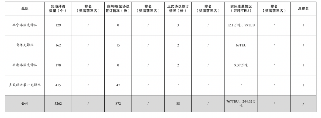 活動開展以來,累計拜訪客戶數(shù)量5262家,簽訂意向/框架協(xié)議數(shù)量872份,簽訂正式協(xié)議88份,實際走量767TEU、244.62萬噸。