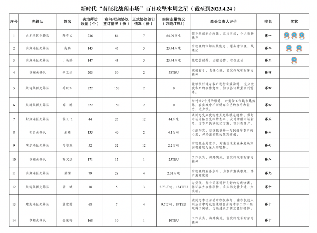 第二名:濱海港區(qū)先鋒隊 高鵬(拜訪客戶145家,簽訂意向協(xié)議46份,簽訂正式協(xié)議5份,實際走量23.44萬噸)